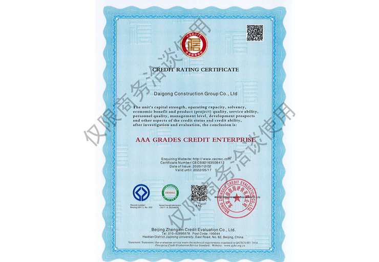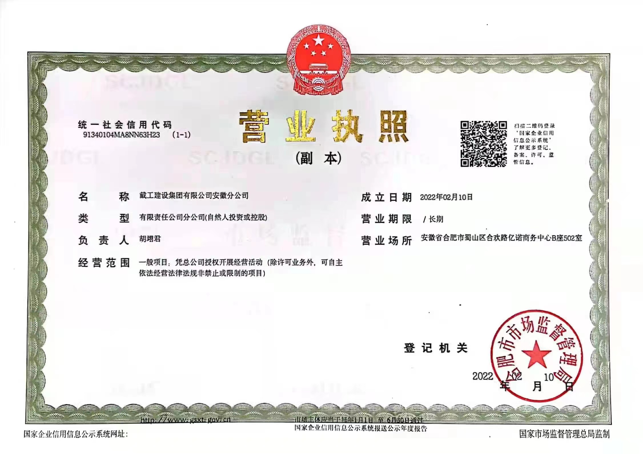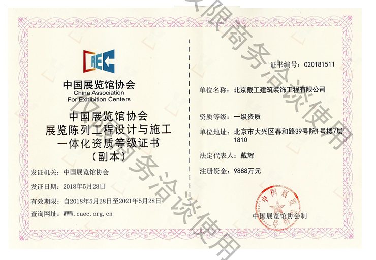 戴工建設(shè)集團(tuán)有限公司,創(chuàng)建于2009年,注冊資本9888萬元人民幣。公司位于北京市大興區(qū)。具有建委頒發(fā)的建筑裝飾裝修專業(yè)壹級(jí),防水保溫工程專業(yè)壹級(jí),建筑幕墻專業(yè)貳級(jí),消防設(shè)施專業(yè)貳級(jí),電子與智能化專業(yè)貳級(jí),特種工程(結(jié)構(gòu)補(bǔ)強(qiáng))專業(yè)不分等級(jí),建筑機(jī)電安裝專業(yè)貳級(jí),環(huán)保工程專業(yè)貳級(jí),鋼結(jié)構(gòu)專業(yè)貳級(jí),建筑工程總承包貳級(jí),建筑裝飾工程設(shè)計(jì)專項(xiàng)甲級(jí),展覽陳列工程設(shè)計(jì)與施工壹級(jí),展覽展示工程壹級(jí)...更多>>